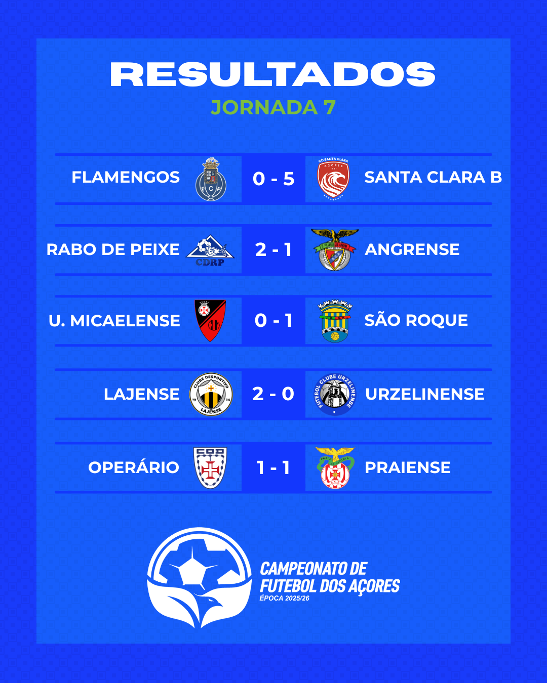 Hoje jogou-se a sétima jornada do Campeonato de Futebol dos Açores (CFA).